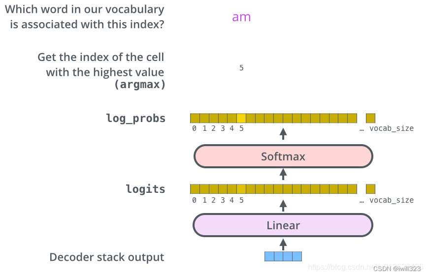 - 当完成decoder的计算后,接下来可以使用self.generator(nn.Linear+Softmax)来进行最后的预测。Output Probabilities是线性层后经过Softmax的概率分布。最大的值对应的index,然后再去字典中查询,就知道预测的词是什么了。