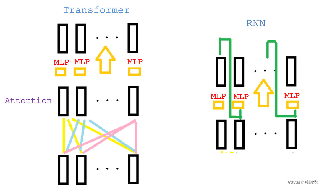 1.时刻t的隐藏状态ht,是由上一时刻隐藏状态 ht−1和 t时刻输入共同决定的。这样可以把之前学到的历史信息都放在隐藏状态里,一个个传递下去。这种固有的时序模型难以并行化处理,无法利用GPU/TPU的并行计算功能,计算性能就很差。这些年做了一些并行化改进,但是问题依然存在。