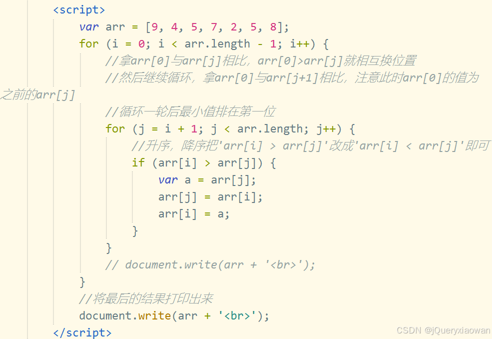 思路:通过数组的第一个元素与后面元素不断遍历比较,将最大(或最小值)的位置换到第一个元素的位置,然后再第二个、第三个……
