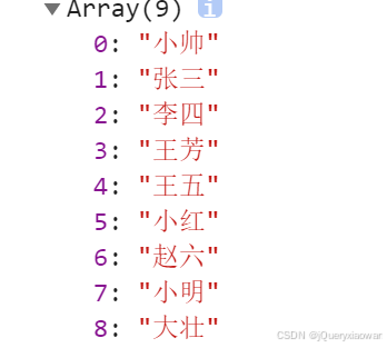 var arr = ['张三', '李四', '王五', '赵六', '小帅', '小红', '大壮', '小明', '王芳'];
