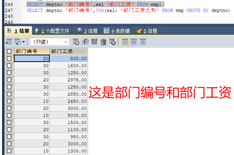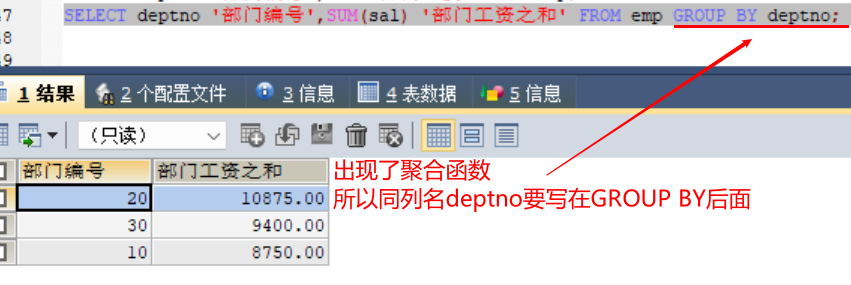# 当需要分组查询时需要使用GROUP BY子句,例如查询每个部门的工资和,这说明要使用部分来分组。