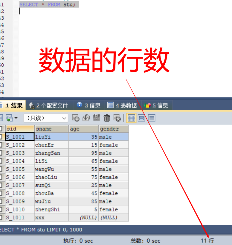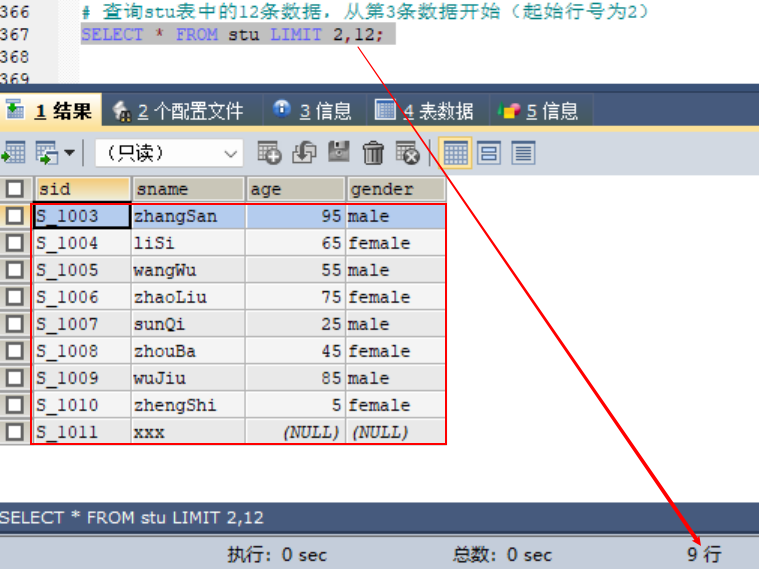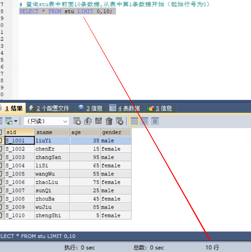 # 查询stu表中前面10条数据,从表中第1条数据开始(起始行号为0)