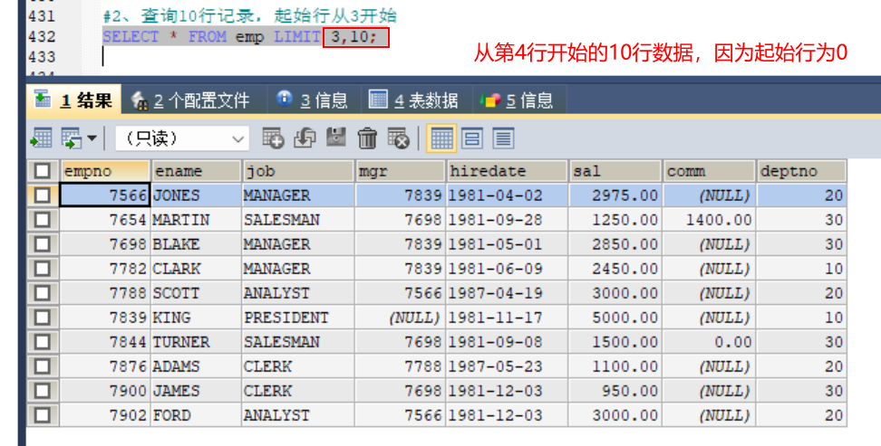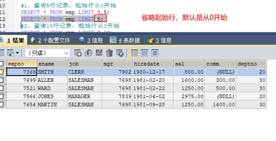 SELECT * FROM emp LIMIT 0,5; 或省略起始行 SELECT * FROM emp LIMIT 5;