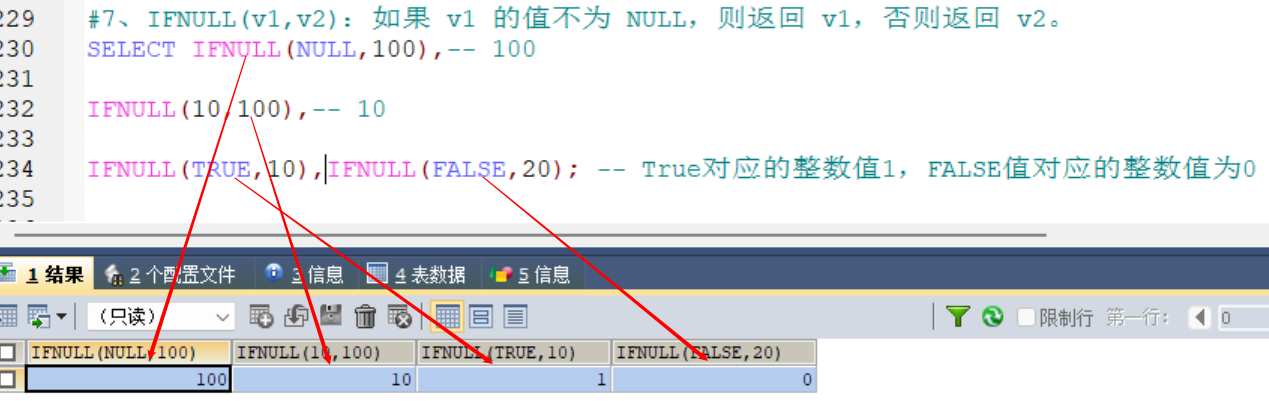 #7、IFNULL(v1,v2):如果 v1 的值不为 NULL,则返回 v1,否则返回 v2。
