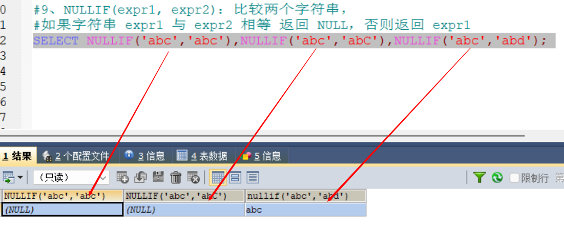 #9、NULLIF(expr1, expr2):比较两个字符串,如果字符串 expr1 与 expr2 相等 返回 NULL,否则返回 expr1(不区分字母大小写)