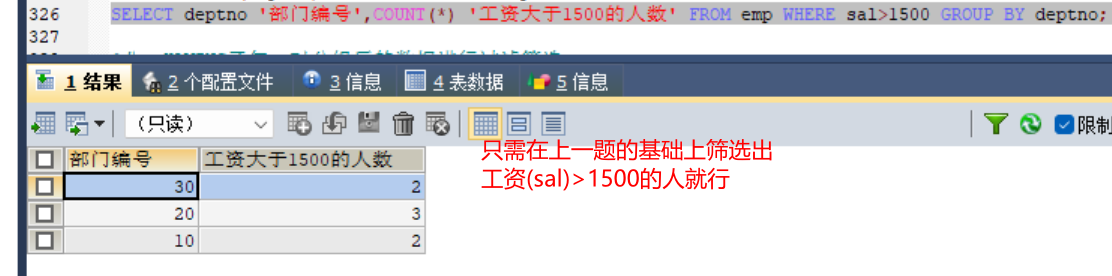 #3、查询每个部门的部门编号以及每个部门工资大于1500的人数