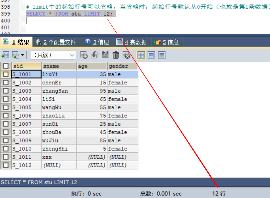 # 查询stu表中的12条数据,从第3条数据开始(起始行号为2)