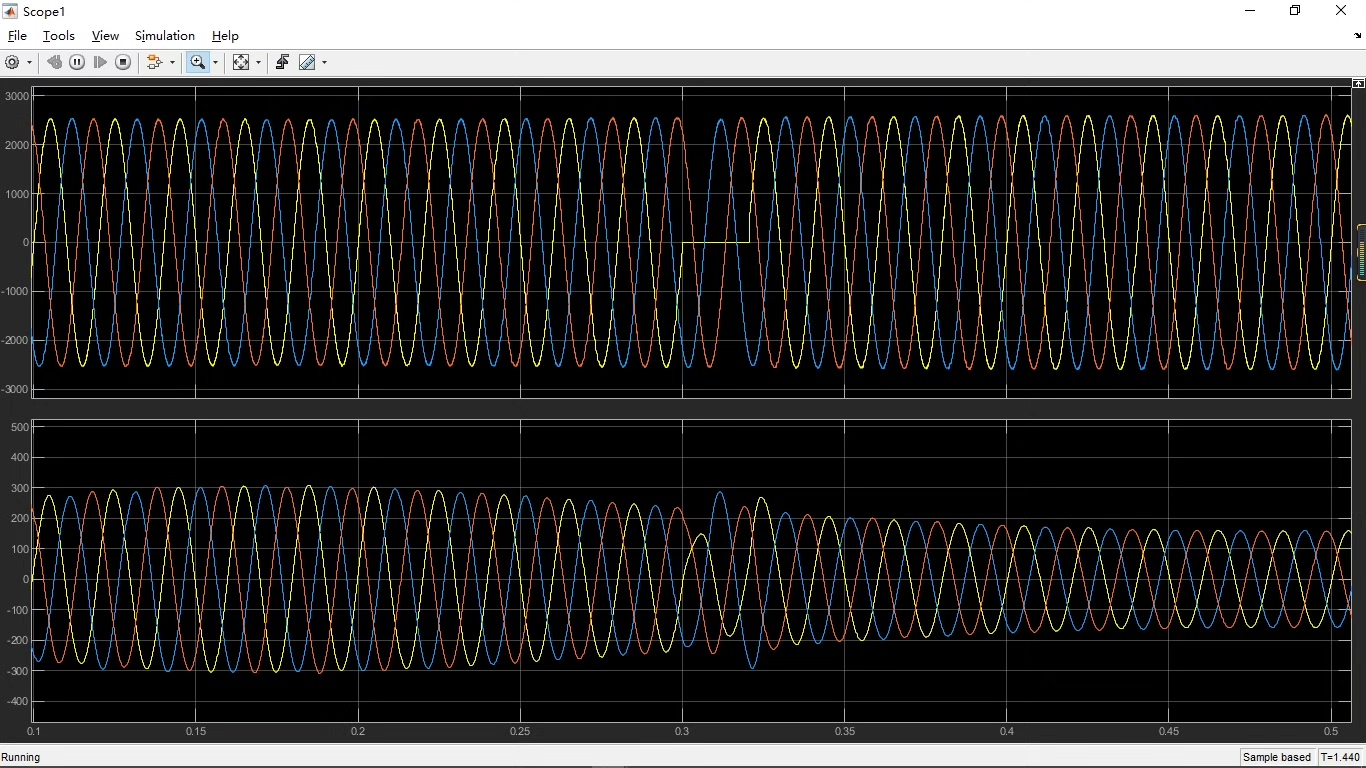 当仿真时间到0.5秒时,这个电阻会从10.001Ω指数衰减到0.001Ω,模拟电弧接地的动态过程。用示波器抓取A相上桥臂电流,能看到明显的双频波动特征——这时候锁相环必须切到正序分量跟踪模式。