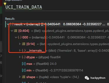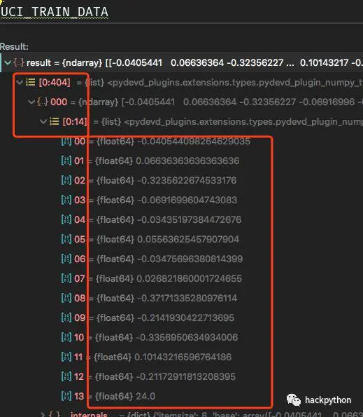 返回数据分成两部分,第一部分是具体的数据,即房子的各种数据数据,第二部分是房子的价格,而这两个部分对应着输入层,当前数据类型依旧值得再次强调,读入数据的数据类型要与对应输入层的数据类型相匹配。