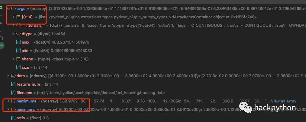 通过最大值、最小值与均值就可以对所有数据进行归一化操作,其中红框中最后一个值为24,表示房价,房价并没有进行归一化处理,还是原始的值,目标值是不能进行归一化操作的,需要注意