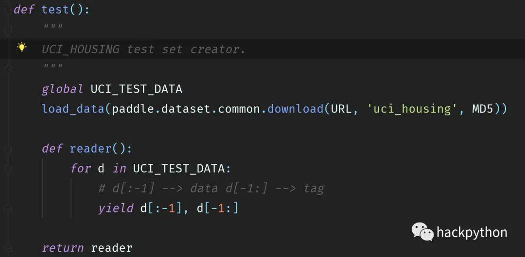 第一点,理解传入模型的数据的情况,比如这里使用paddle.dataset.uci_housing.test()方法获得测试数据,其源码如下: