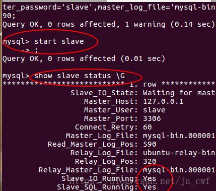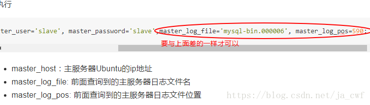 (5) 配置从服务器要连接的主服务器的IP地址和登陆授权,二进制日志文件名和位置