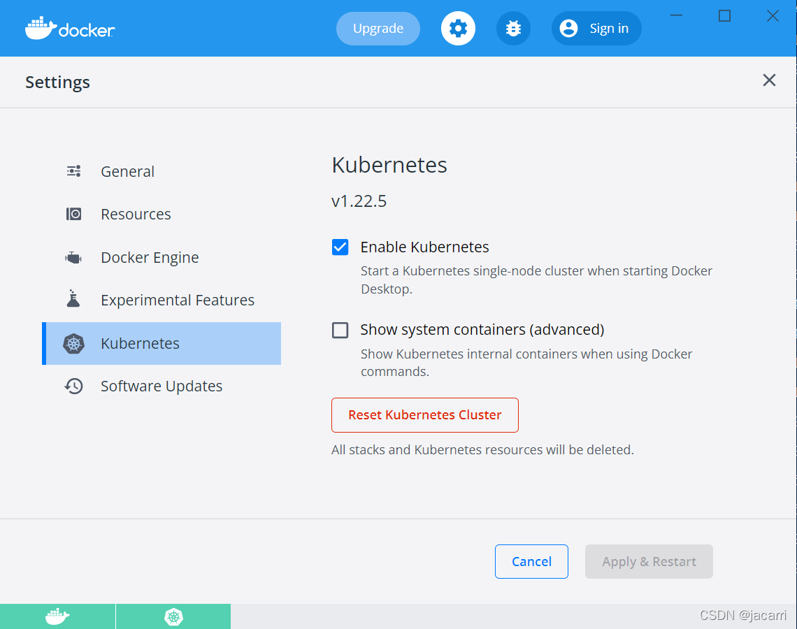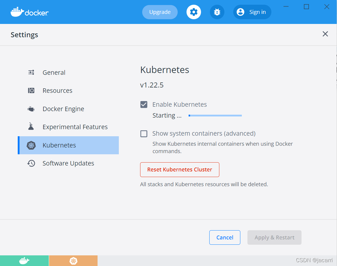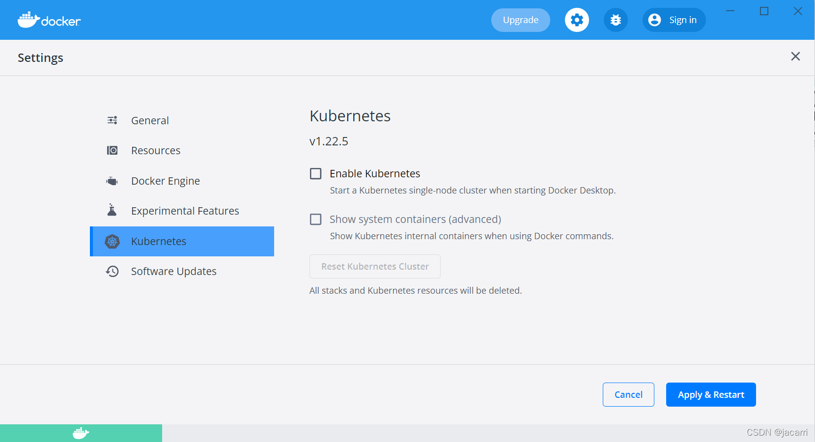 新版Docker Desktop 启动Kubernetes时,不需要手动设置mirror地址。直接在Dockers Desktop 的settings界面中 启用就行。