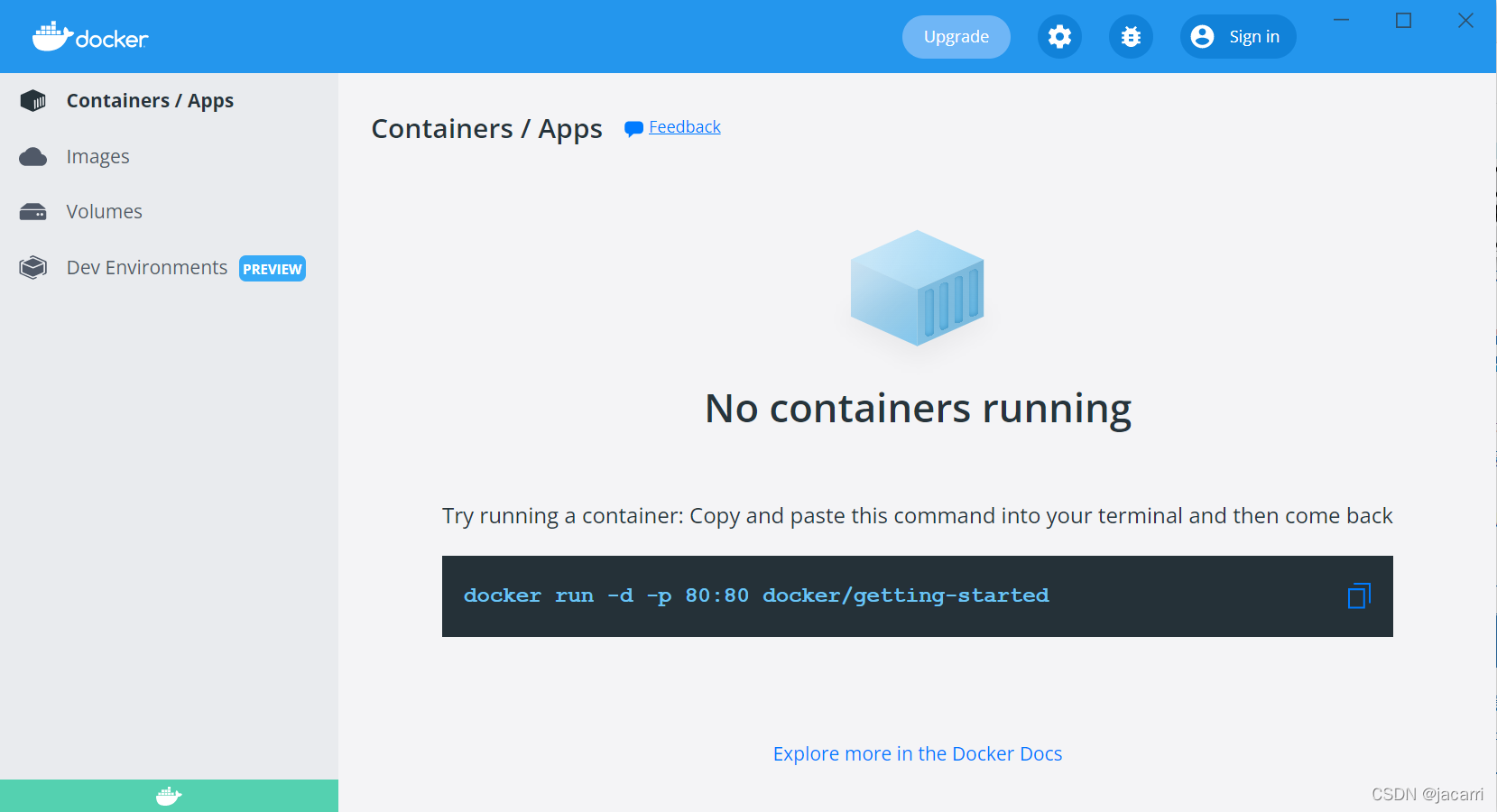 内核升级完毕后重启电脑, 打开【Docker Desktop】等一会 即可看到下图, 说明Docker 环境安装完毕