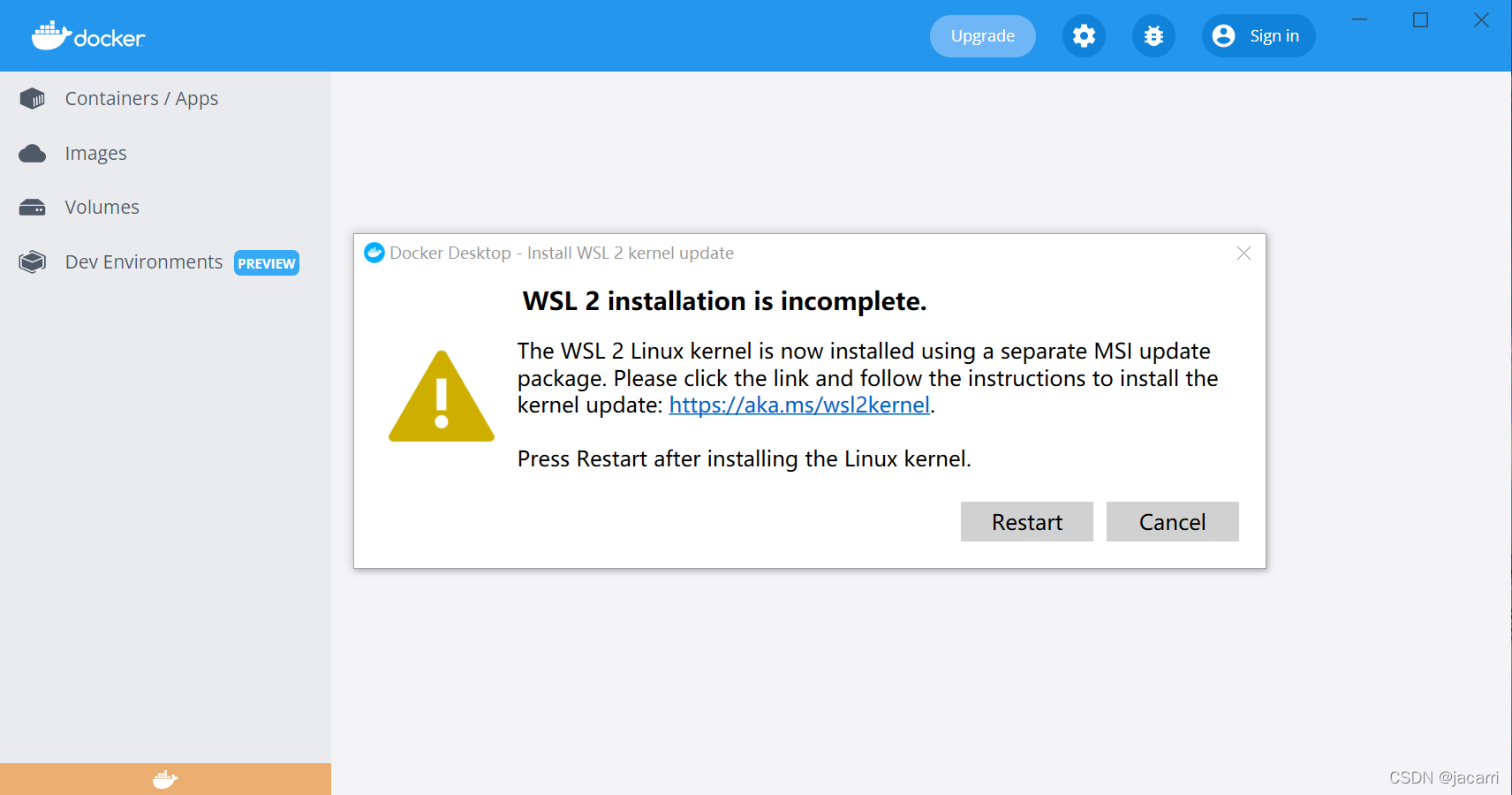 安装完成后运行Docker Desktop如果有下图提示,说明WSL2 环境安装未完成