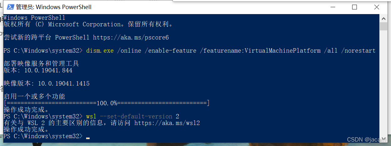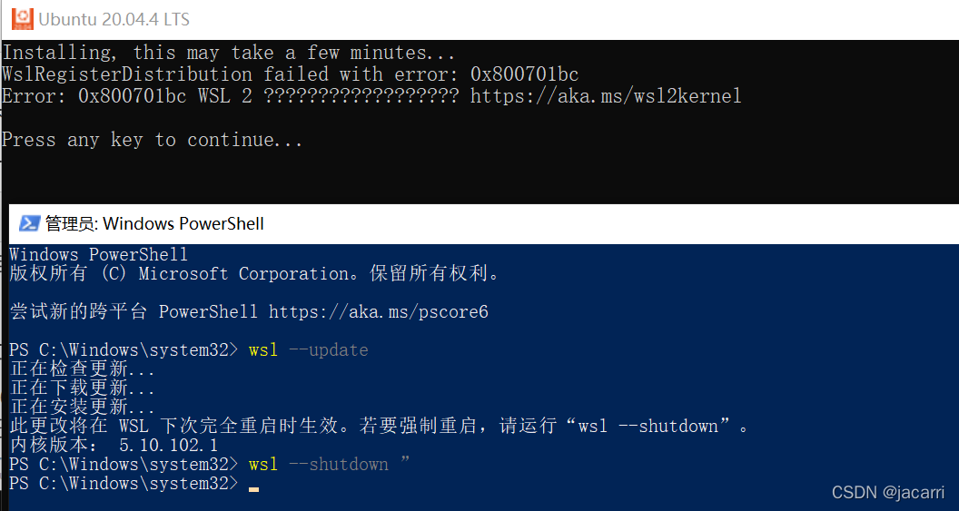 若运行【Ubuntu 20.04.4 LTS】时 提示【WslRegisterDistribution failed with error: 0x800701bc】,说明需要升级WSL2内核,参考流程如下: