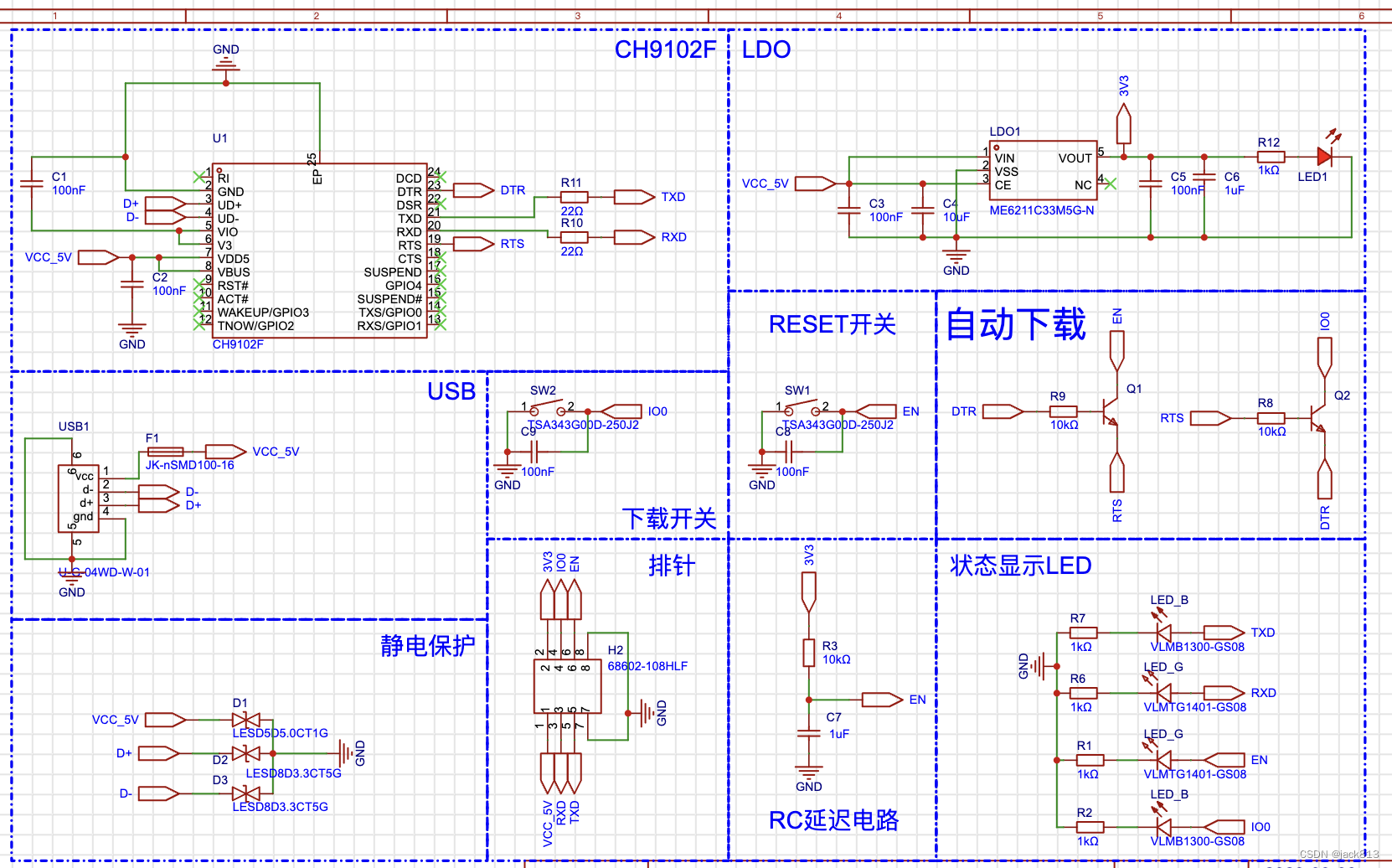 电源降压LDO芯片主要是将5V电压降低到3.3V为ESP32和CP2102供电。