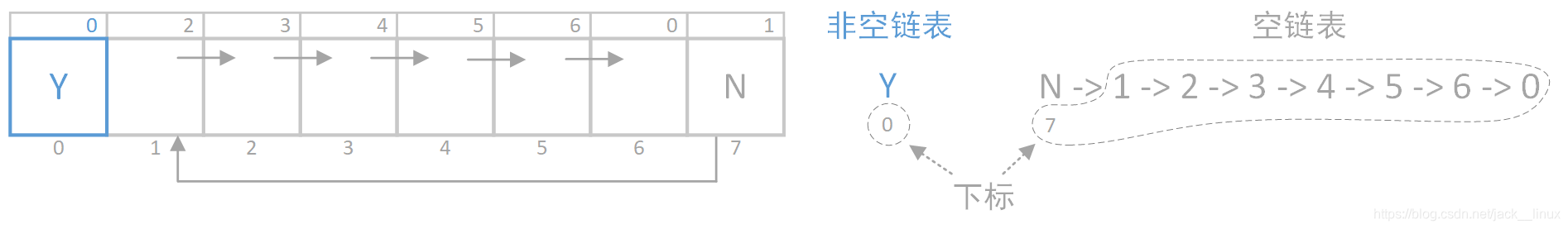 (1)由于开始阶段除了首位两个特殊头节点外,其他元素皆为空节点,故,需要将数组首元素的游标初始化为 0(上面说过,两个链表的尾节点的游标定义为 0,表示没有后继节点,暂时还没插入嘛),数据初始化为 ’Y‘;