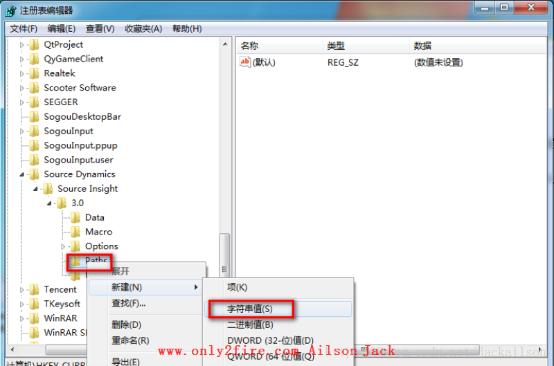 首先打开注册表,定位注册表项:HKEY_CURRENT_USER\Software\Source Dynamics\Source Insight\3.0\Paths,在Paths上右击鼠标新增一个字符串值,名为“UserDataDir”,然后双击“UserDataDir”设置source insight的默认路径,我这里设置为:C:\Users\Public\Documents\Source Insight,点击确定。