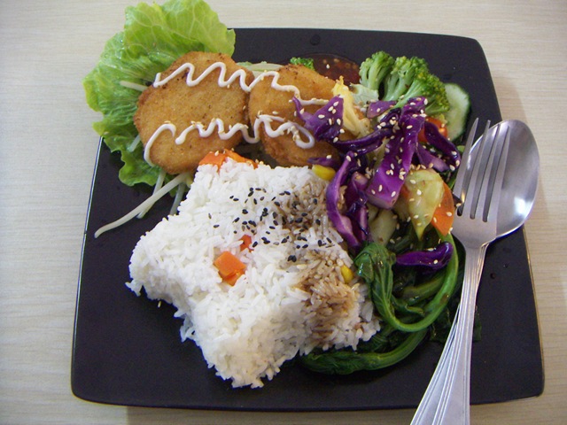 这家店的东西倒是不贵,大多数套餐都是15元左右,如果只要小食还可以降到10元左右。点了三样东西,说实话,味道真是不错,色彩、营养搭配的也不错,可就是分量小了点,我要吃饱,肯定要double了。