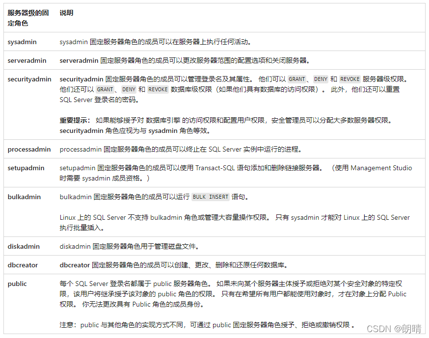 public 每个数据库用户都属于 public 数据库角色。如果未向某个用户授予或拒绝对安全对象的特定权限时,该用户将继承授予该对象的 public 角色的权限。