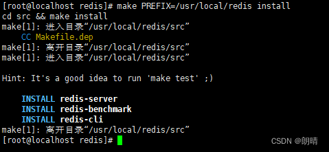 这里多了一个关键字 PREFIX= 这个关键字的作用是编译的时候用于指定程序存放的路径。比如我们现在就是指定了redis必须存放在/usr/local/redis目录。假设不添加该关键字Linux会将可执行文件存放在/usr/local/bin目录,