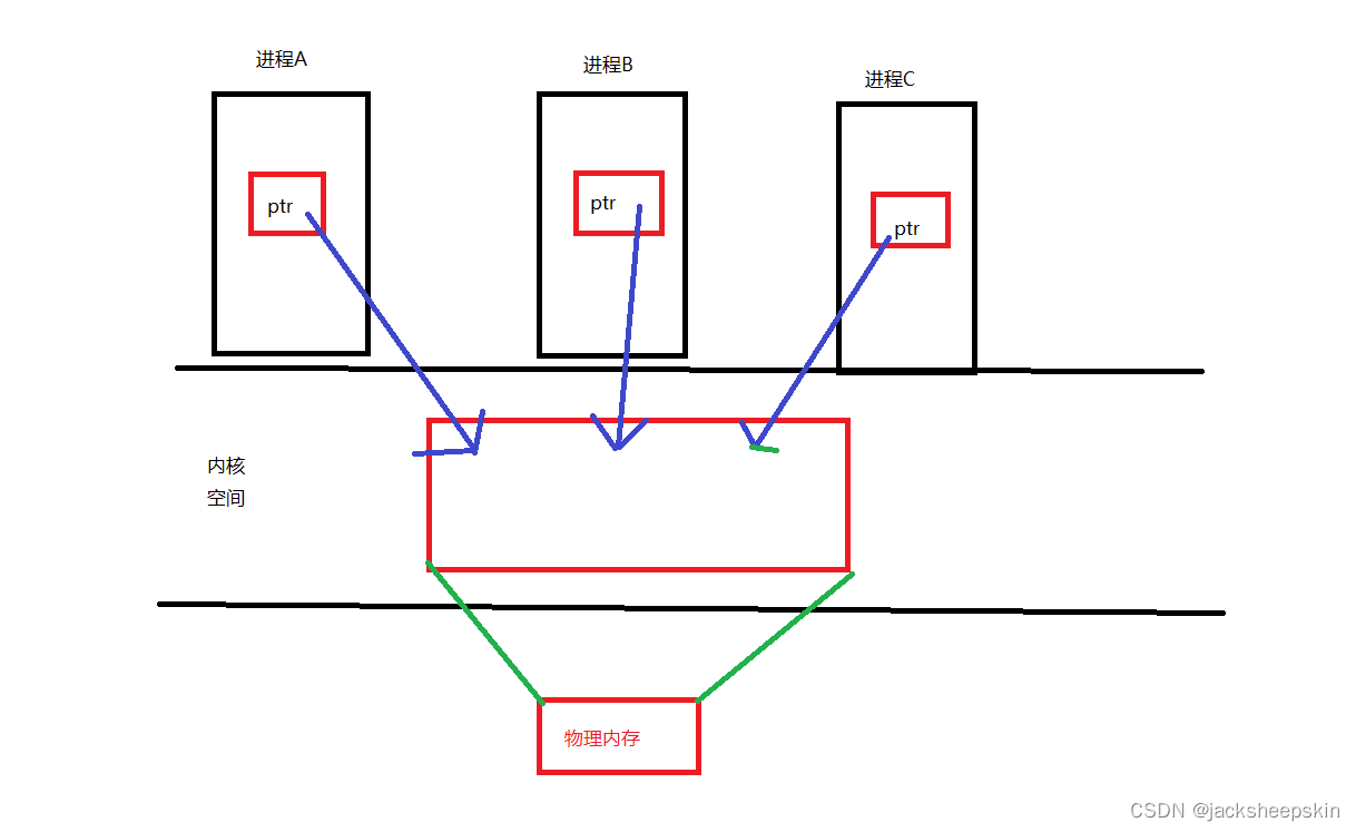 共享内存第一步是先将一块物理内存映射到内核空间,在内核空间维护出一块共享内存,然后每个进程可以通过指针的方式共同访问这块内存空间,并进行读写操作,实现进程通信。类似malloc用法。