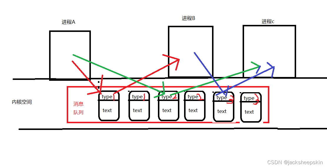进程在内核空间中维护出消息队列,每个进程借由消息队列的msgid对消息队列进行读写操作,消息队列中的信息是一个结构体,存储着消息的种类(身份证)和消息的内容,多个进程间可以通过消息的种类来进行通讯,例如:进程A放了一个种类为A的信息,进程B只读取种类为A的信息,通过这种方式实现了进程间的定向信息传输。
