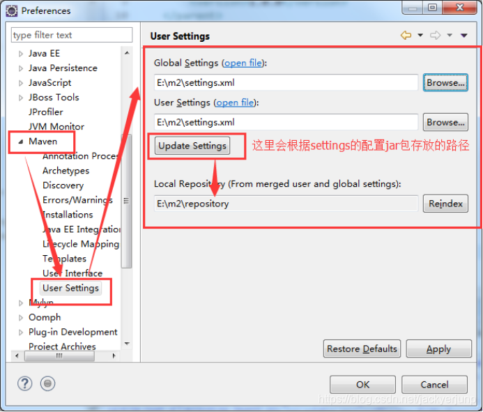 Window -> Preferences -> Maven -> User Settings -> Browse…
