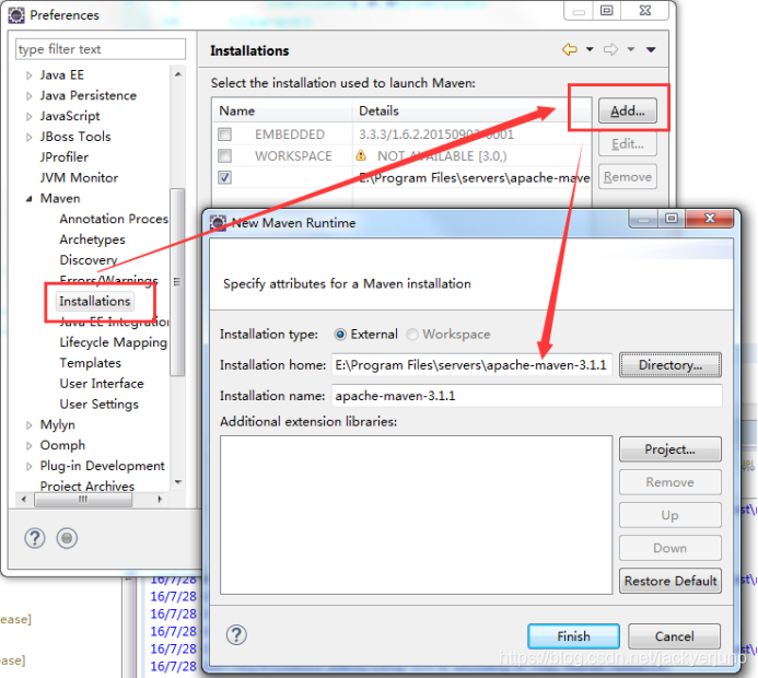 Window -> Preferences -> Maven -> Installations -> Add,如图: