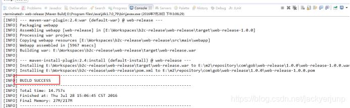 控制台会出现日志,BUILD SUCCESS表示打包成功,BUILD FAILE表示失败: