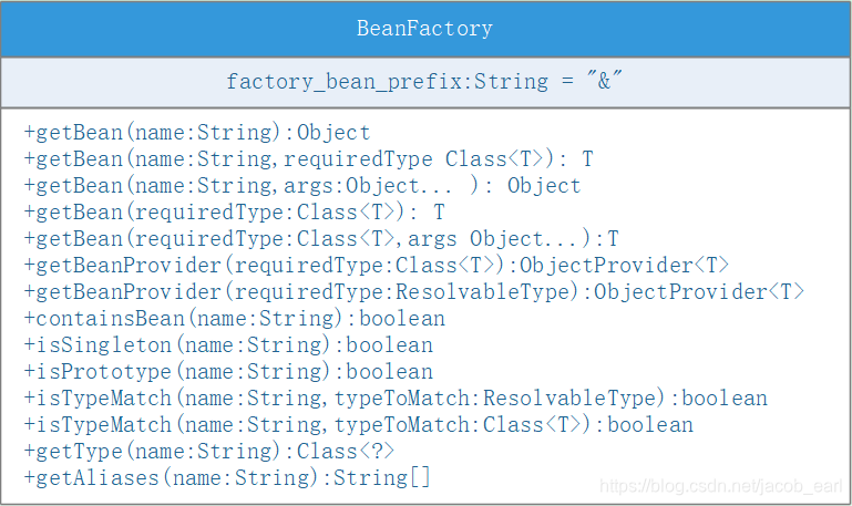 通过上图我们可以看到,BeanFactory的诸多方法里主要分为两类,首先是获取组件的,主要分为以下三类: