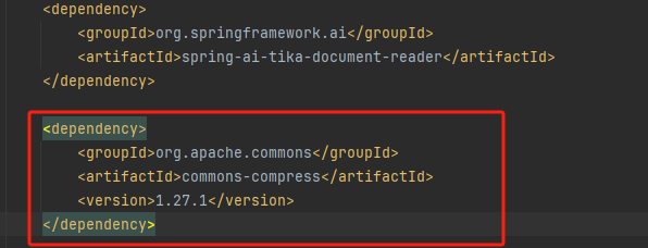 原因:spring-ai-tika-document-reader依赖了commons-compress。由于ommons-compress与其他模块的版本冲突,所以排除了本模块的ommons-compress之后,导致无法获取得到text内容。