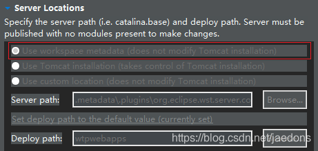 大家仔细对比下你自己的和我图片上的,你会发现你默认的选项应该是Use workspace metadata这个选项,只不过是笔者我改为了tomcat的安装路径罢了,