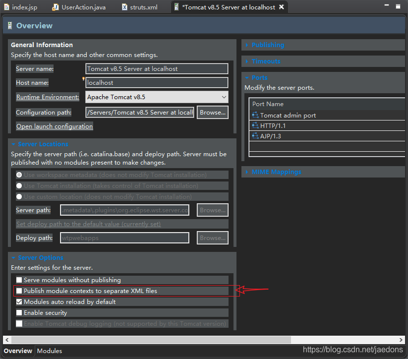 看到没,在Server Options 选项里有个 Publish module contexts to separate XML files 的选项,到这里我们也一样把勾勾上,不过问题不是这样就一定解决了,我说过有的朋友这样做了,问题依然没有解决,把勾勾上以后记得保存,如果警告依然存在的朋友们跟着我继续往下看。
