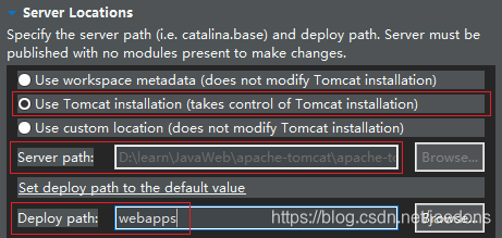 因为Use workspace的路径文件夹不方便后面的讲解中要找的文件,所以笔者使用第2个tomcat安装目录来操作,而Deploy path:你如果没有改过的话,应该是叫wtpwebapps,所以此处读者根据自己的Deploy path的值进行下面的操作。