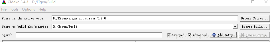 3.然后打开CMake,CMake请自行下载,将eigen-eigen-git-mirror-3.2.830文件夹下的CMakeLists.txt拖至CMake中,Where is the source code为默认的eigen-git-mirror-3.2.8,Where to build the binaries修改为我们新建的Build文件夹,我们可以勾选Grouped和Advanced。然后点击Configure,选择Visual Studio 12 2013。