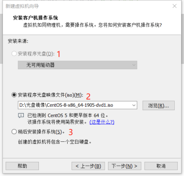 step3 在这个窗口中标记为1的部分是从光盘安装,标记为2的部分是选择一个已经下载好的光盘镜像,标记为3的创建完成后不会立即安装虚拟机,我们选择一个已经下载好的光盘镜像之后点击下一步