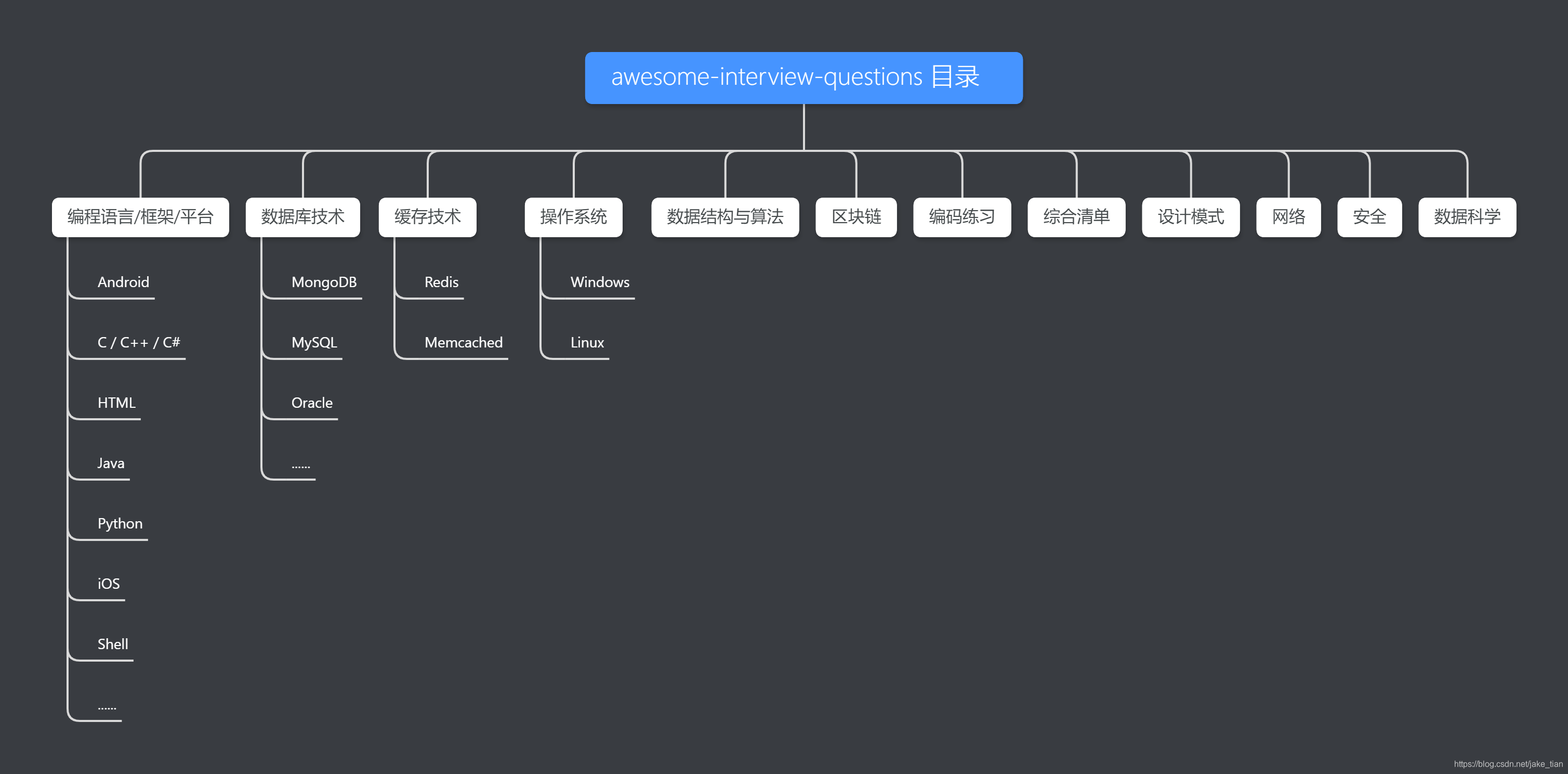 该开源项目主要包括内容: 编程语言/框架/平台、数据库技术、缓存技术、操作系统、数据结构与算法、区块链、编码练习、综合清单、设计模式、网路、安全、数据科学等;