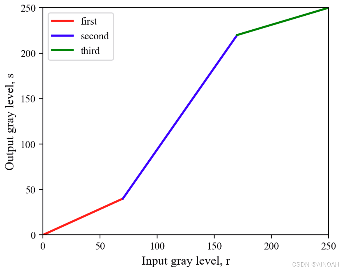 光照不足、成像传感器的动态范围偏小、图像获取过程中镜头参数的设置不当都有可能导致低对比度图像。对比度拉伸可以扩展灰度级范围,使得图像的灰度级尽可能覆盖整个理想范围。分段线性变换是典型的对比度拉伸方案。