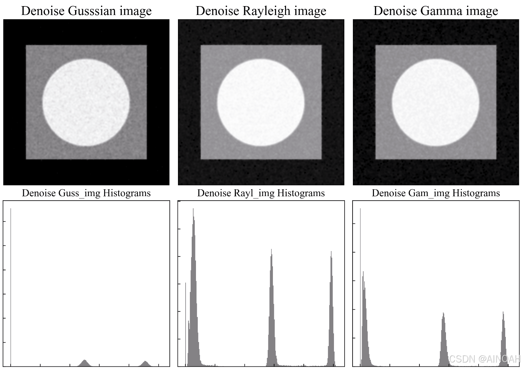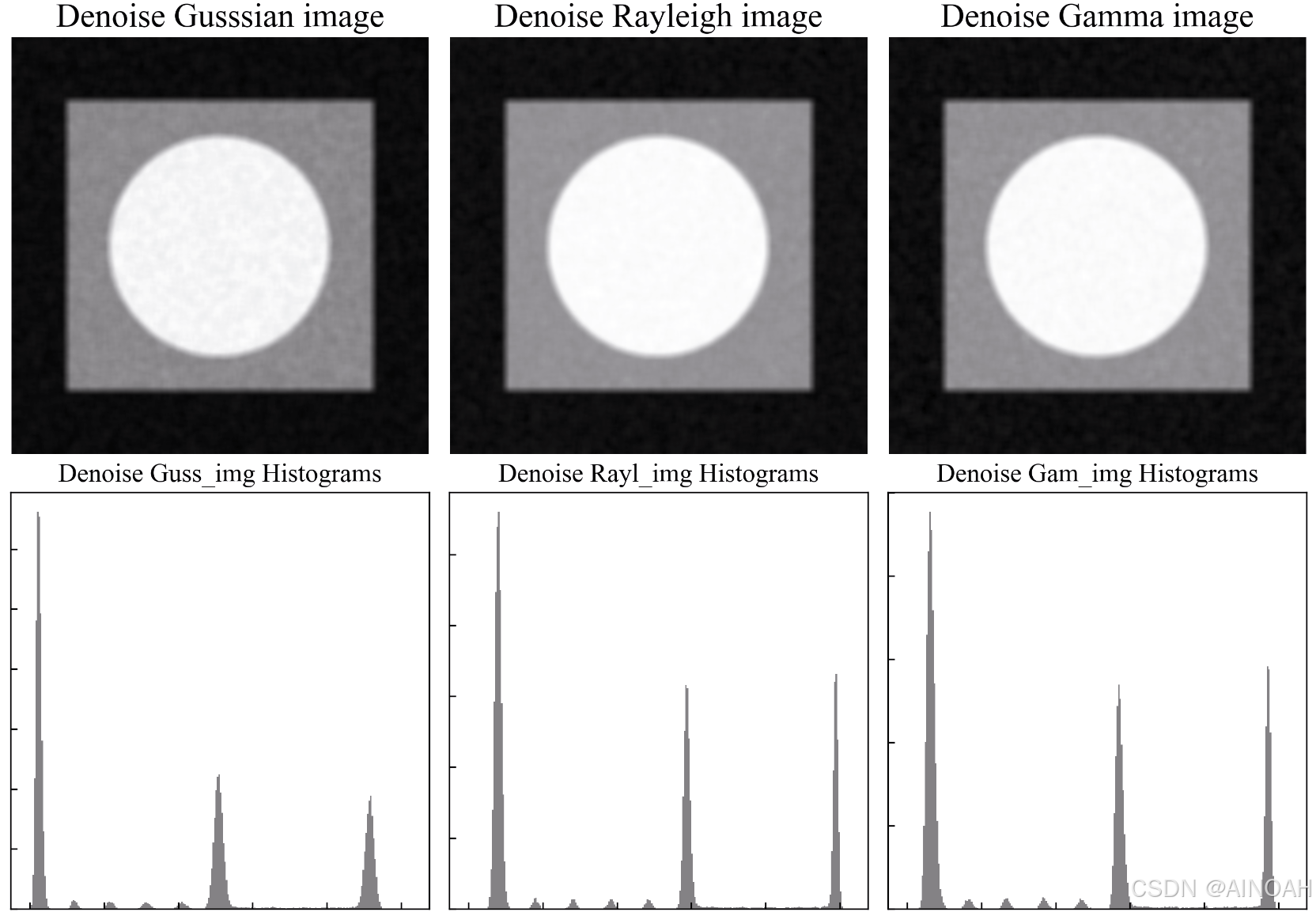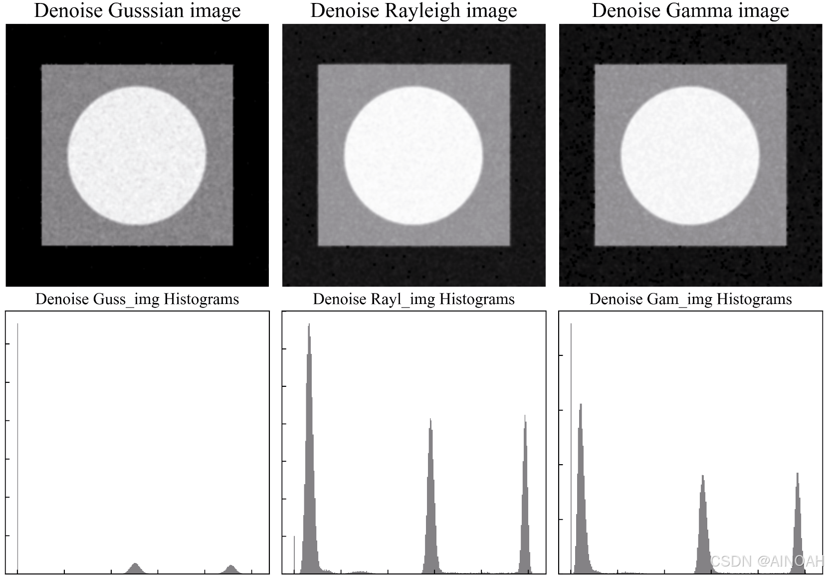 可以看到,利用5x5的归一化核进行平均后得到去噪的图片,其灰度直方图的趋势和原图类似(在特定灰度处呈细高状态)。算术平均滤波是通过取邻域像素的平均值来处理每个像素,可以明显的去除噪声,但是会导致图像中的细节被模糊。