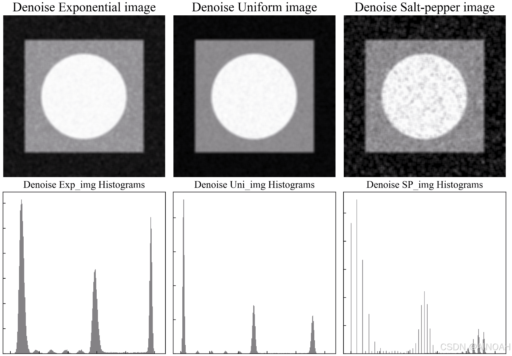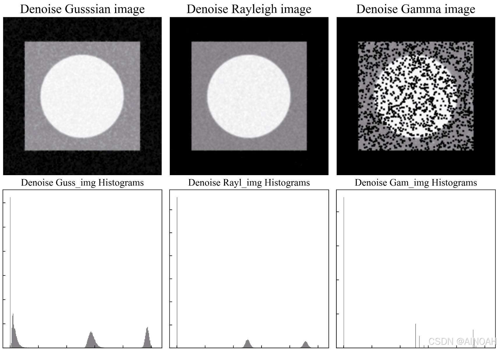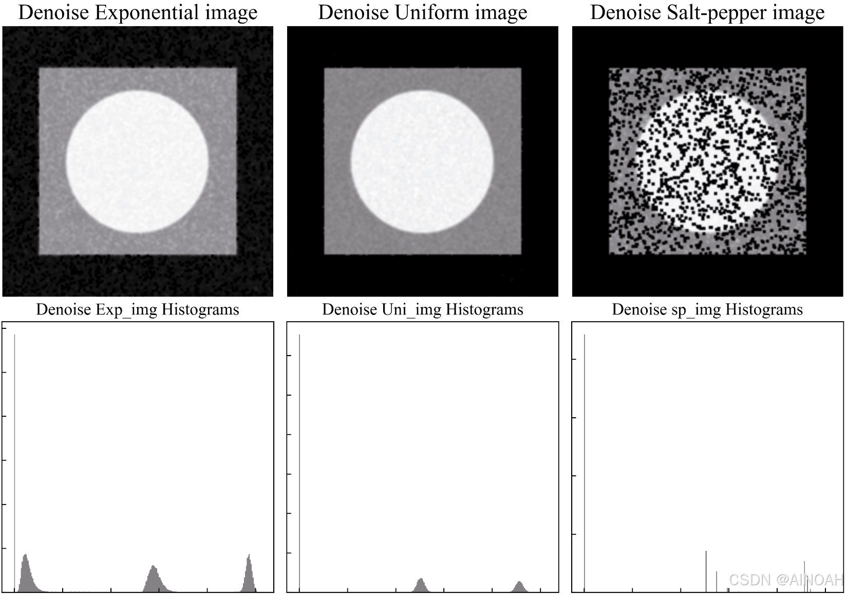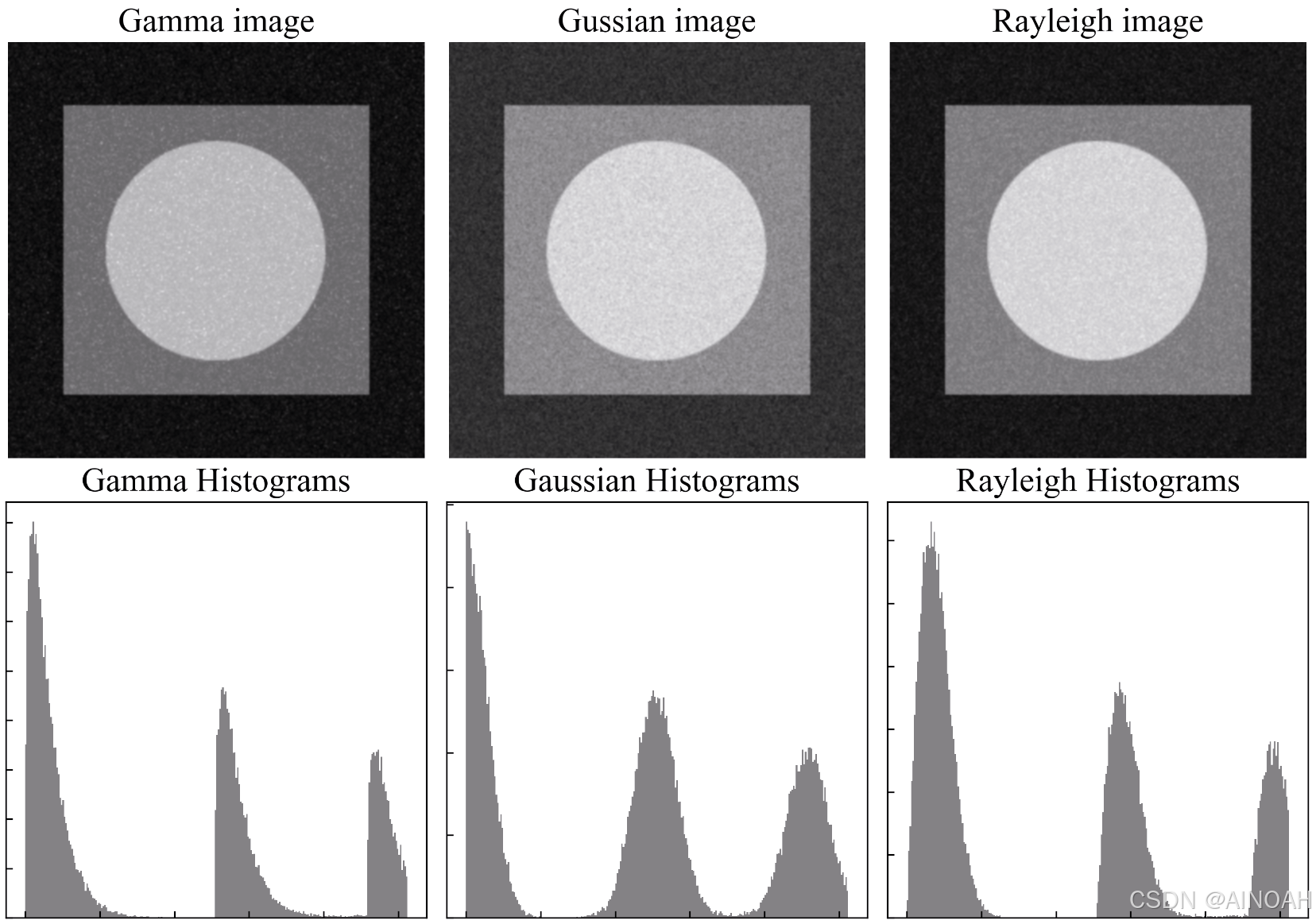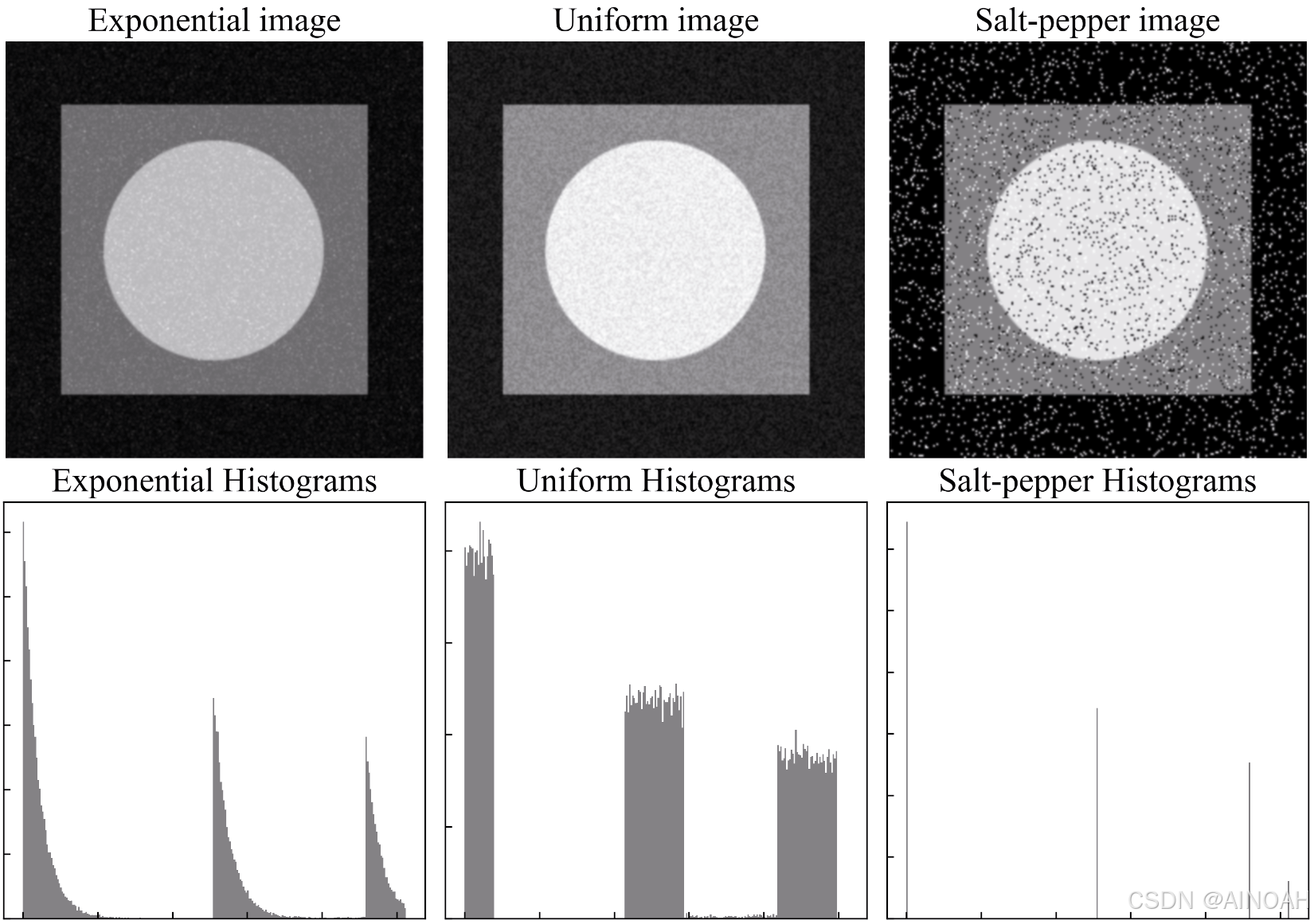 下图添加了不同的噪声的图像和对应图像的直方图,可以从灰度直方图中直观的看出不同分布的噪声对原始图像灰度的影响。