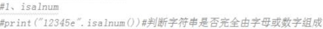 功能:检测字符串是否由数字,字母和文字等组成 格式:字符串.isalnum() 返回值:布尔值 汉字当作普通字符处理,没有标点和特殊字符就是真,空字符串为false