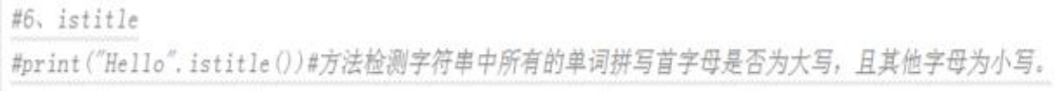 功能:检测字符串是否符合title()的结果 格式:字符串.istitle() 返回值:布尔值