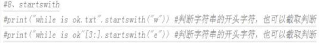 功能:检测字符串是否以指定的字符串开头 格式:字符串.startswith(查找字符串) 返回值:布尔值