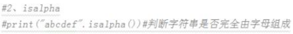 功能:检测字符串是否有字母和文字组成 格式:字符串.isalpha() 返回值:布尔值,汉字当作普通字母处理。空字符串为false