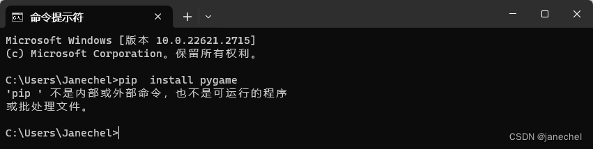 ② 添加成功后,重启命令提示框,重新输入python和pip install pygame。