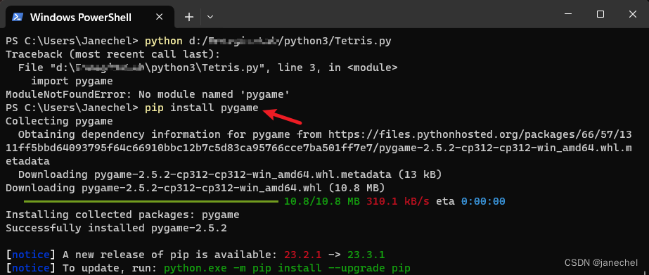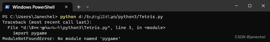 报错提示:在命令提示符中输入.py文件,或在其他编译器(如PyCharm)运行时,出现“ModuleNotFoundError: No module named 'pygame'”报错
