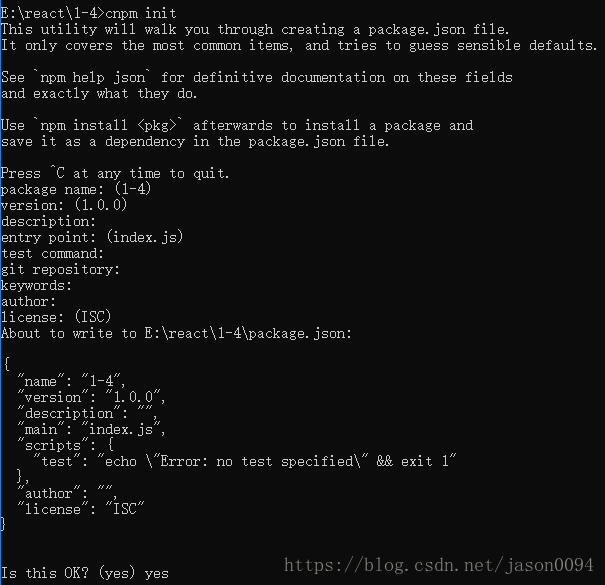 cnpm init注:事先配置了淘宝镜像源