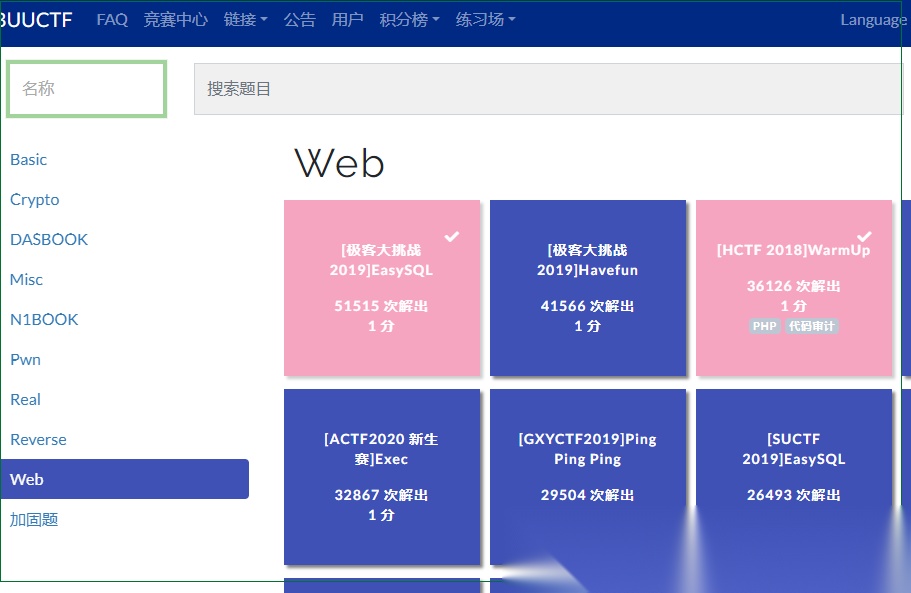 目前该靶场共分为几个部分:Basic(基础)、Crypto(加密)、DASBOOK(刷题书)、Misc(杂项)、N1BOOK(是Nu1L Team为方便读者打造的免费平台)、Pwn(漏洞利用)、Real(实际会遇到的漏洞)、Reverse(逆向)、Web(网络)、加固题(各个赛事的经典案利)。
